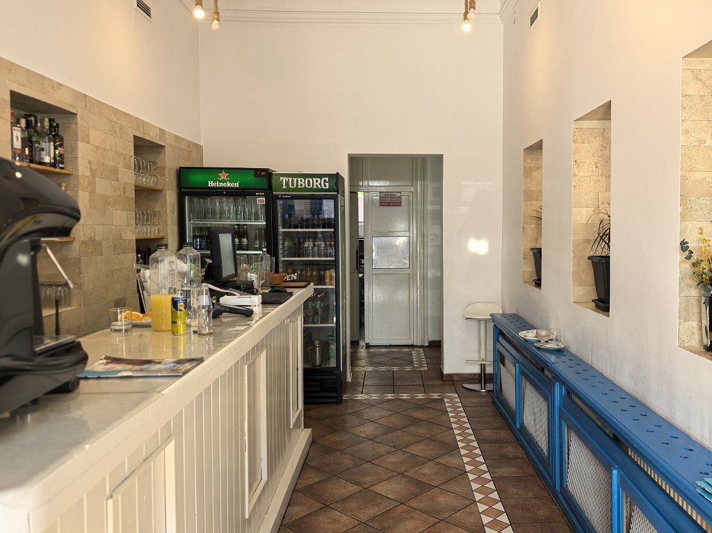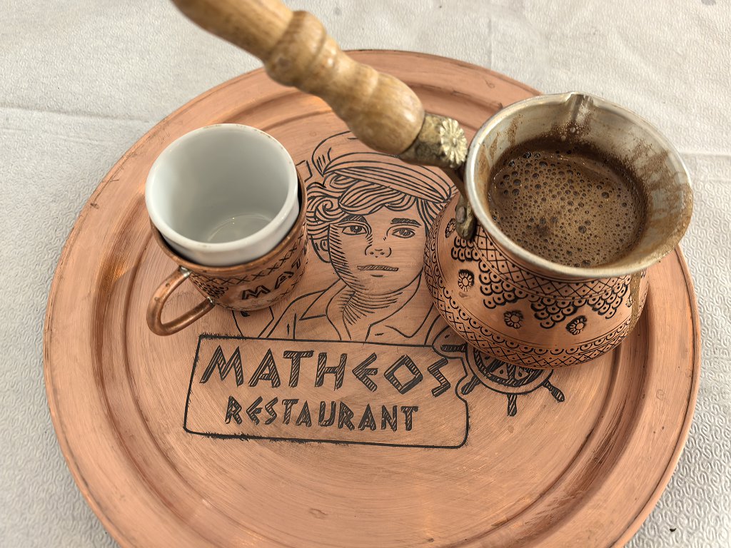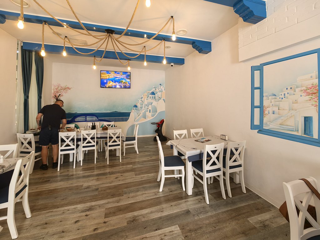 Aici, la Matheos, au o terasă și două saloane de mărime mijlocie, amenajate ultra-minimalist, în stil tavernă, cum se vede în poze. Pe căldură, aerul condiționat cu greu face față. Se pare, de asemenea, că meniurile de la Kostas și de la noul Matheos sunt identice – nicio surpriză, desigur, de vreme ce e un restaurant dedublat.