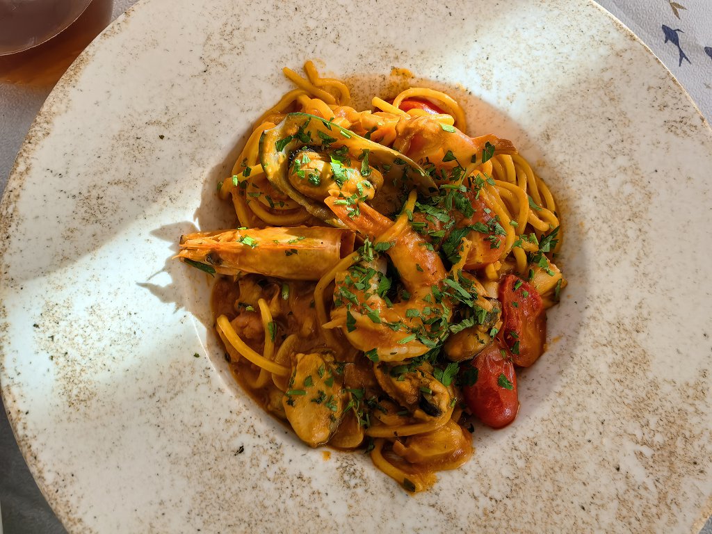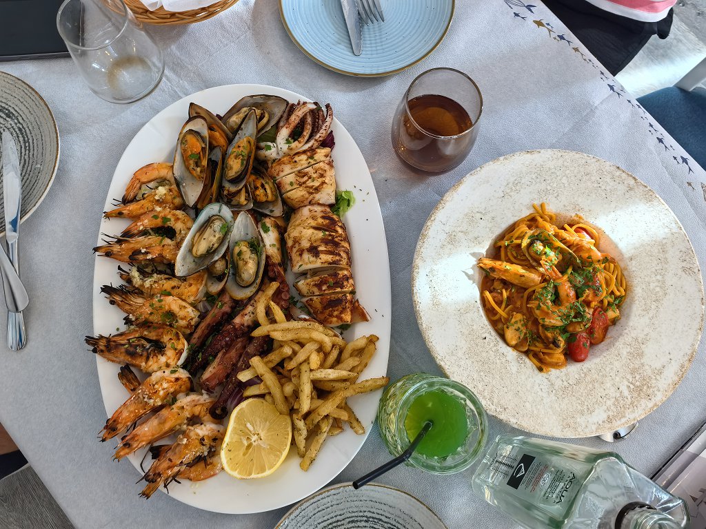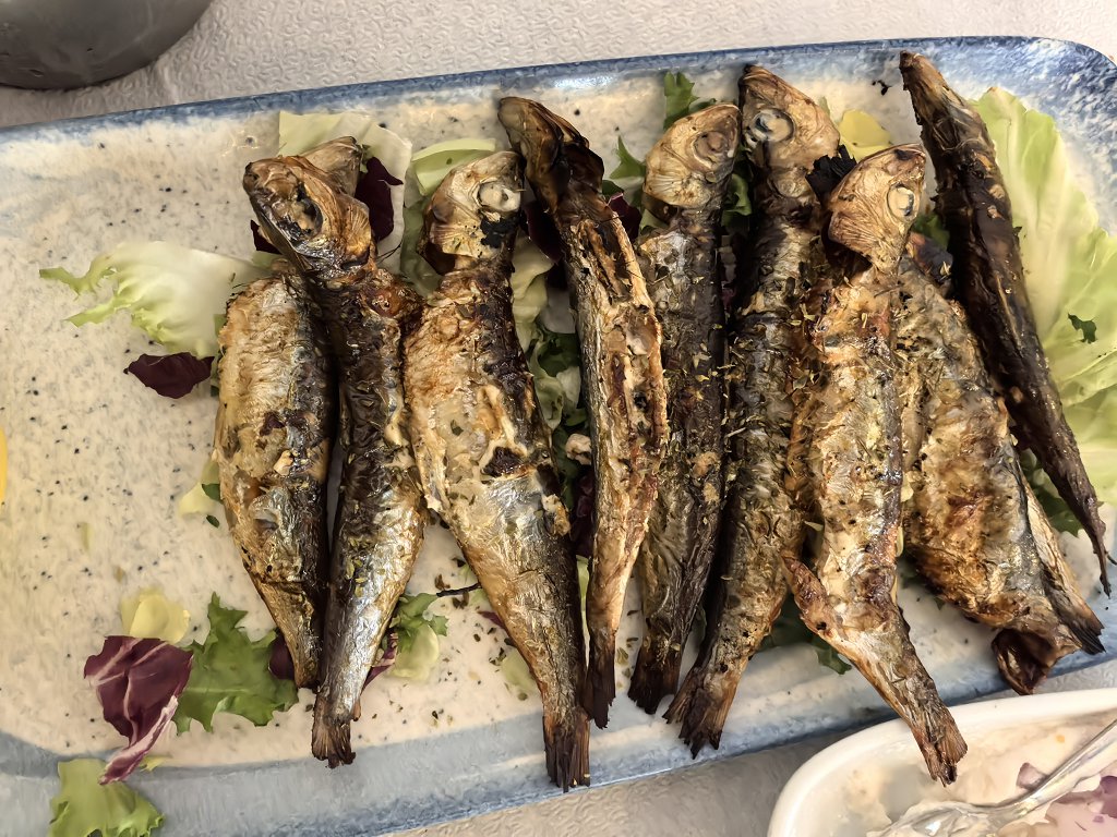 Mâncarea destul de bună și porțiile proletare neobișnuit de mari pentru un bucureștean care nu iese prea des din zona de nord. Doar sardinele au fost fără gust, au rămas în farfurie. Creveții cu unt au fost buni, dar curățați și mâncați cu nervi. L-am întrebat de 3 (trei!) ori pe chelner dacă sunt curățați. Că altfel nu i-aș fi luat. Mi-a răspuns că da, fără să clipească. După care, desigur, mi i-a adus cu cap și cu coadă, așa cum e obiceiul pe la București.