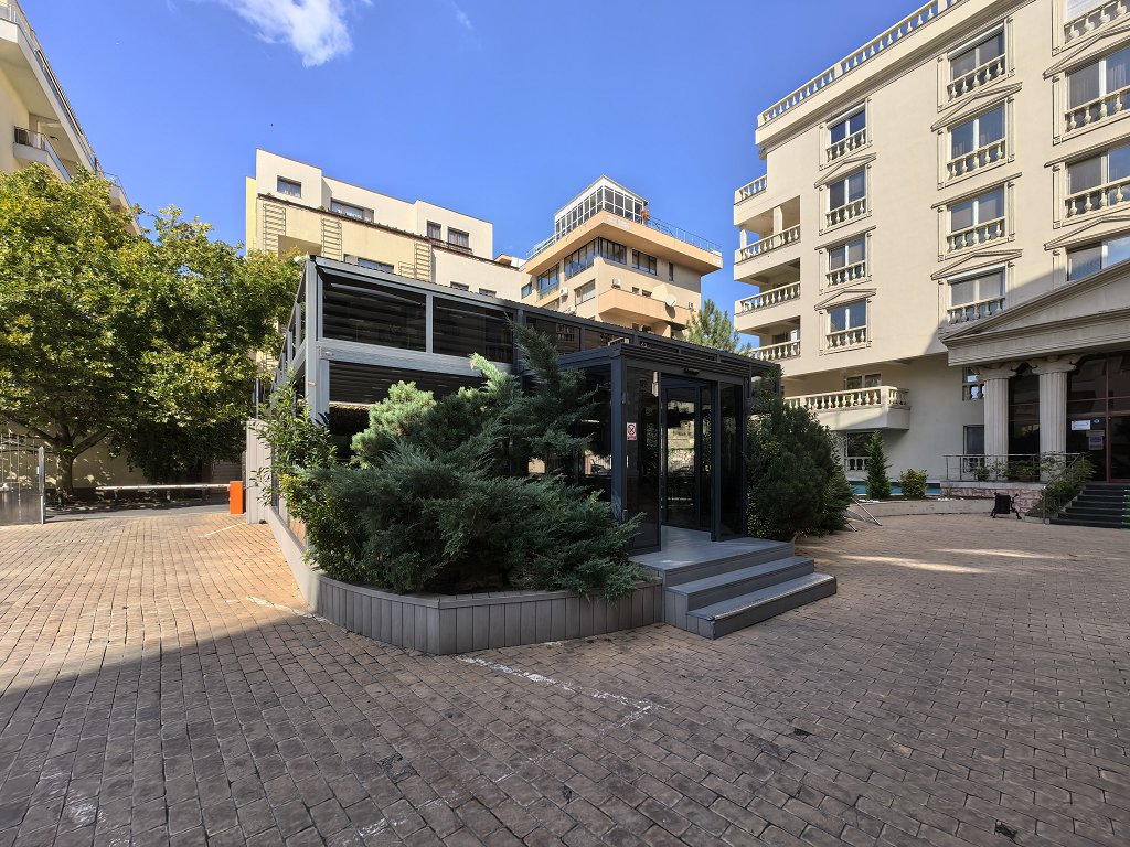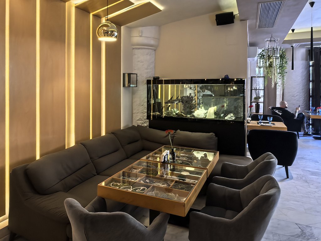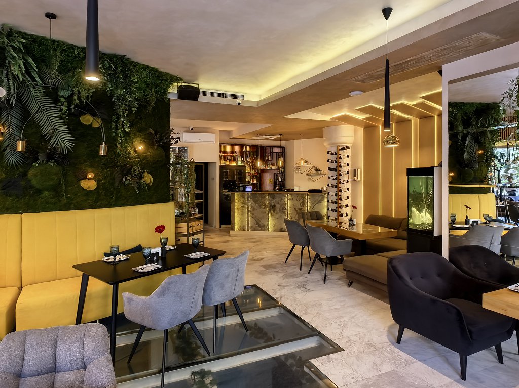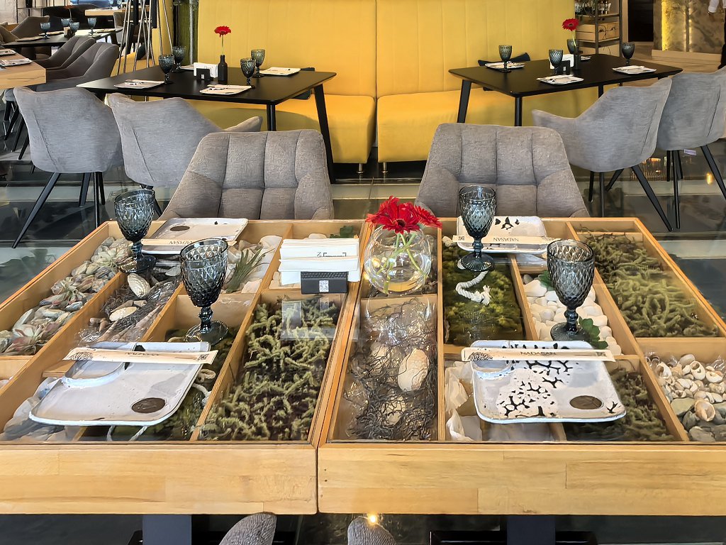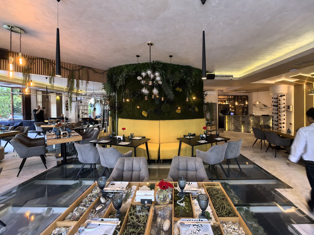 Restaurantul e mijlociu ca marime, nu are terasa, si e deasupra unei piscine la care te uiti in jos printr-o originala podea de sticla. E amenajat destul de bine, modern, luminos, colorat, tineresc. E mai frumos decat oricare dintre cele de dinaintea lui.