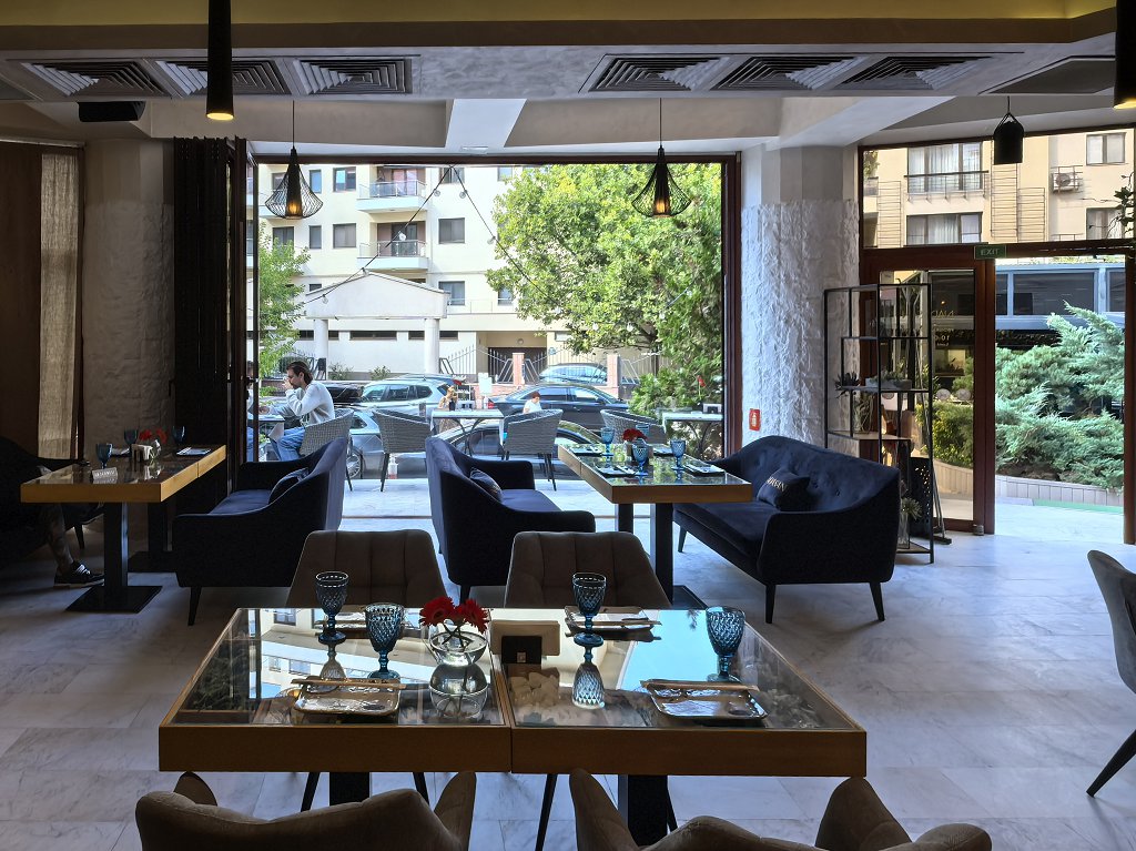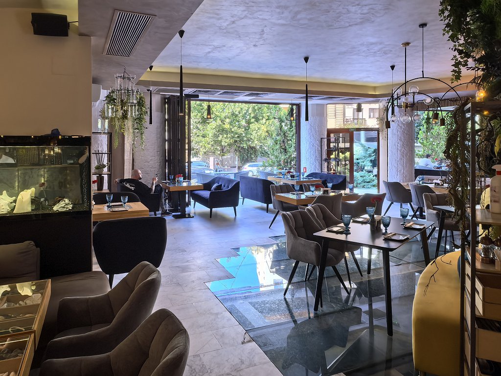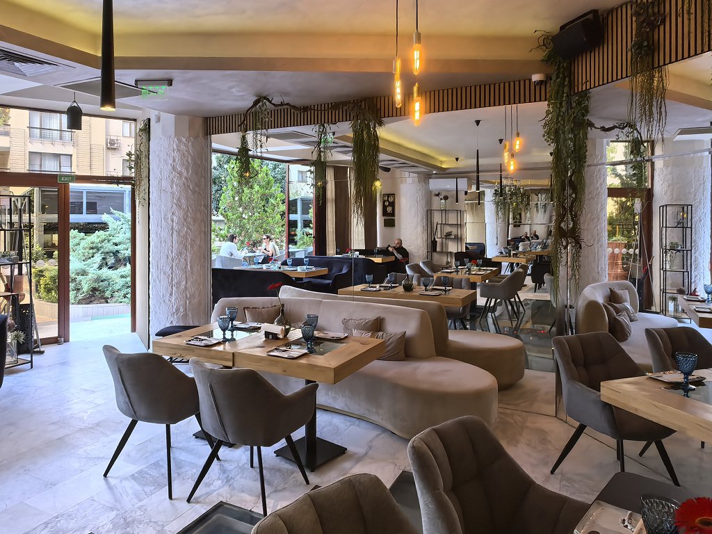 Restaurantul e frumos, luminos, cu canapele comode. Cred că la fel era și la început, din câte îmi aduc aminte din anii lui primii. Clădirea e cam caraghioasă pentru timpurile noastre, desigur, dar asta nu cred că deranjează pe nimeni. Și cu atât mai puțin pe clienții casei. Chelnerul tinerel – cel din poză – foarte plăcut, binevoitor.