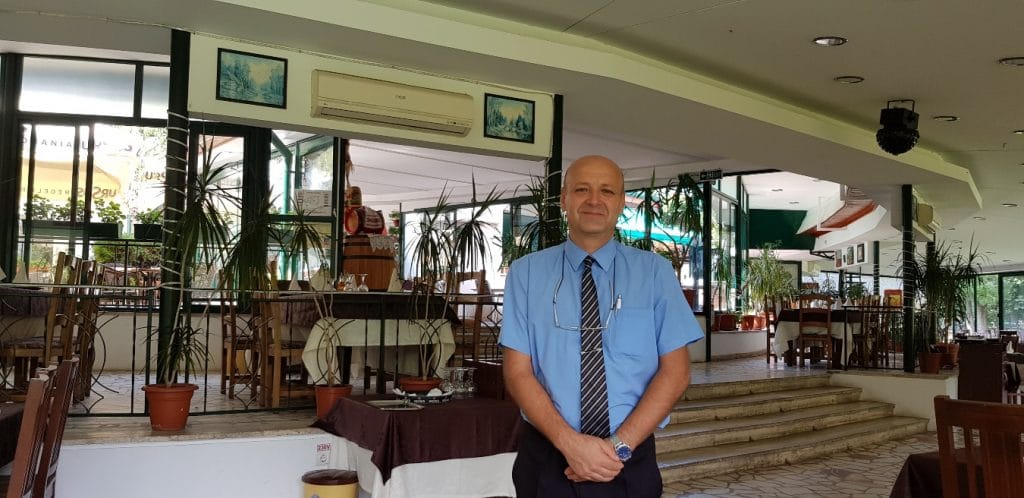 Am fost preluat de domnul din poza, probabil un fel de sef, fiindca era imbracat altfel decat ceilalti chelneri. Nu i-am luat in serios la inceput amabilitatea si zambetul, insa in scurt timp mi-am dat seama ca e chiar natura lui sa fie astfel, sa fie atent la tine, la ce ai nevoie. Adica exact ceea ce astepti de la cineva care te primeste. A mai venit un chelner in varsta, mai ursuz acela, insa si de el mi-a placut.