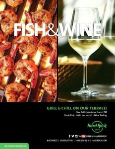 Hard Rock Cafe declară seara de 19 iulie prilej de delectare pentru iubitorii de peşte şi de fructe de mare! Bucăţi de somon proaspăt şi aromat, creveţi sau dorada vor sfârâi pe grătarul încins de pe terasă, începând cu ora 18.00.
